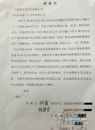 沒有一項事故是人們所愿意看到和愿意經歷的,不過林海寶是幸運的,在事故發生后,江西經銷商高安海鑫汽車貿易有限公司積極向一汽解放青島汽車有限公司申請使用“JH6用戶維護基金”,向二人提供了50000元的愛心救助款,幫助他們共渡難關。這筆愛心資金直接減輕了林海寶和胡戟兩人的經濟損失,也證明了事故無情,人間有愛。