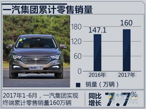 一汽集團作為中國老牌特大型汽車央企,2017年以647.8億美元的營業收入再次入圍世界500強,排名第125位,排名較去年提升5個名次,并已連續13年入圍《財富》世界500強排行榜。2017年1-6月,旗下各品牌累計零售銷量達160萬輛,同比增長7.7%。