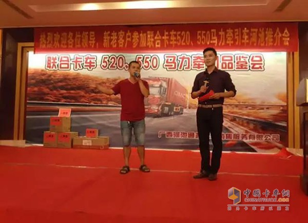 本次廣西河池聯合卡車品鑒會,加深了河池客戶對聯合卡車大馬力牽引車新產品的了解,讓聯合卡車與客戶的聯系更近了一步。