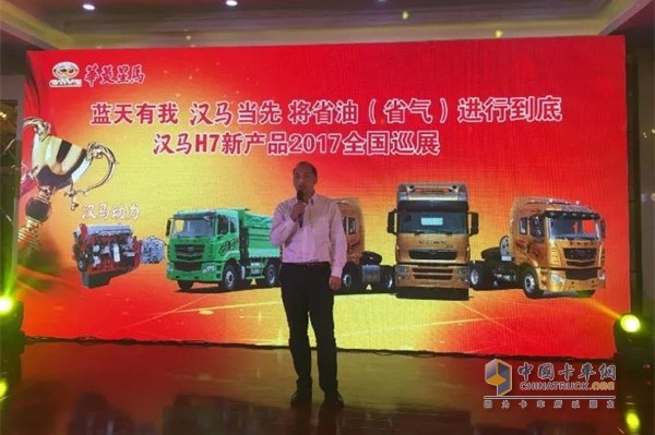 華菱星馬總經理助理葛曉生在發言時與現場用戶們分享了華菱的企業文化、發展歷程和取得的諸多榮譽,并就漢馬H7、漢馬動力的核心優勢進行了深入淺出的講解。他表示,早期進入內蒙市場的華菱,憑借的是工程車,此次我們帶來的是升級版的牽引車,也更加符合鄂爾多斯的運輸市場需求。去年年初,我們就開始著手準備漢馬H7新品,致力于打造一款高端物流車。經過一年多的努力,期間我們的新品經歷了嚴苛的道路試驗,甄選建立了嚴格的供應商體系,從而保證每一輛走向市場的漢馬H7都是精品。目前,我們決定將批量接受訂單的時間定格為11月1日,由華菱星馬的總部基地批量生產,同時為了讓鄂爾多斯地區的客戶購車無憂,我們的配件中心庫已經設立,500萬的配件已經到達。此言一出,現場立刻報以熱烈的掌聲。