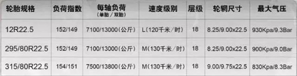 各型輪胎的參考數據