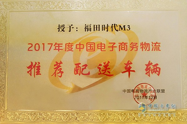 2017年12月20日,福田時代M3在第七屆中國電子商務與物流企業家年會頒獎典禮上榮獲“2017年度中國電子商務物流推薦配送車輛”殊榮,為福田時代M3的優秀品質與魅力又增添了實力的見證與榮耀的光輝。