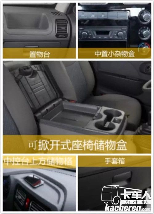 儲存空間多,滿足置物需求。1750mm的超寬駕駛室,讓康鈴K成為同類產品中的最寬車型,空間寬敞舒適,駕駛人員可以自由操縱。