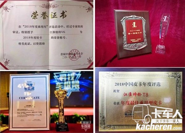 駿鈴V6在首屆中國商用汽車大會上獲得榮獲“2018年度輕卡”稱號,江淮轎卡X5連接連獲得“第一高端小卡”、“2018賺錢小卡之王”兩項大獎,用實力證明了自己,成為了轎卡市場上當之無愧的標桿車型。帥鈴T8更在多項評比活動連奪“2019年度節油車型”、“年度最佳乘用性皮卡”、“二零一八年度智造皮卡”等五項大獎,著實令人稱贊。