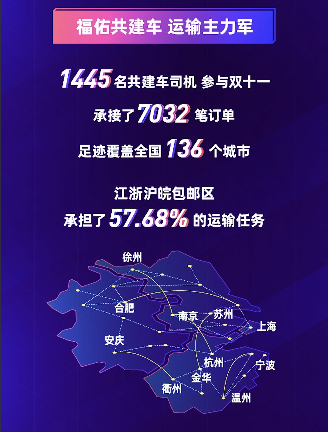福佑卡車的智能調(diào)度系統(tǒng)是專為城際整車運輸場景開發(fā)、用算法分配訂單的系統(tǒng),在業(yè)內(nèi)獨創(chuàng)了AI調(diào)度車輛的隨機(jī)散跑模式。福佑卡車公布的戰(zhàn)報顯示,此次雙十一,智能調(diào)度系統(tǒng)調(diào)度了1445名共建車司機(jī)在全國136個城市,在訂單量最為密集的江浙滬皖區(qū)域,共建車司機(jī)承擔(dān)了57.68%的運輸任務(wù)。
