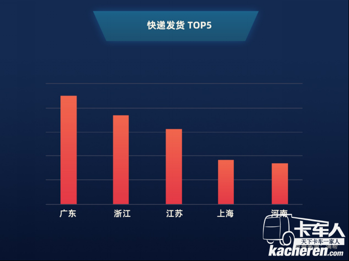 滿幫大數據顯示,“雙十一”當日,快遞類貨物出港省份TOP5分別為廣東、浙江、江蘇、上海、河南,這5省貢獻了全國60%的發貨量。可見,珠三角、長三角仍穩穩地保持著電商優勢。