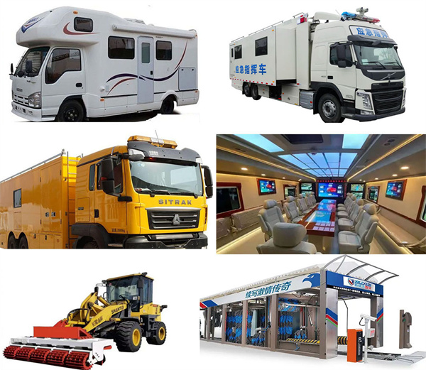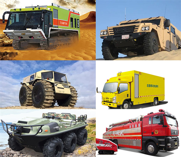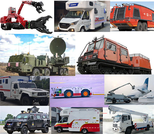 救護車、醫療車、軍警用車、商用車、指揮車、消防車、后勤保障車輛、領導專用車、多用途車(MPV)、電視轉播車、雷達車、軍事監理車、X光檢查車、監測車、越野車、清理除雪車、全地形車、水陸兩棲車、通信車、機場車、航天車、校車、清障車、房車、旅居車、清障車、環衛車、市政專用車、裝卸車、工程救險車、道路救援車、防彈運鈔車、高空作業車、郵政車、起重車、攪拌車、挖掘車、推土車、油罐車、冷藏運輸車、礦用載重車、集裝箱車、工程專用車、壓路車以及不同型改裝車輛等。
