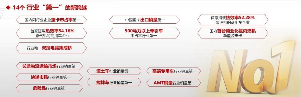 2022年,中國重汽整車銷量實現24.9萬輛、收入突破1214億元,是行業(yè)銷量最高、市場下滑最少、運行效益最好的企業(yè),行業(yè)龍頭地位持續(xù)穩(wěn)固,并實現了14個“第一”。