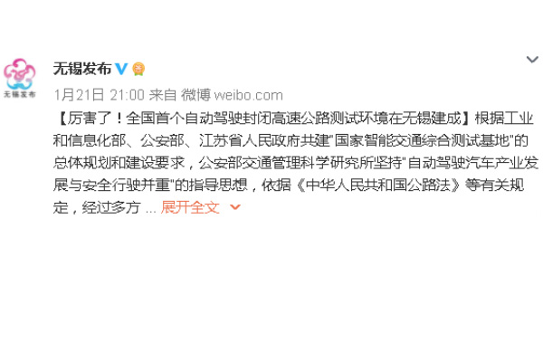 全國首個自動駕駛封閉高速公路測試環境落地無錫
