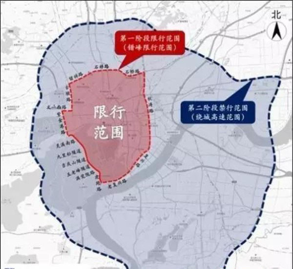 第二階段,2019年10月8日起,全天禁止在繞城高速公路(不含繞城高速)圍合區域內所有道路及高架(含匝道以及附屬橋梁、隧道)內通行。