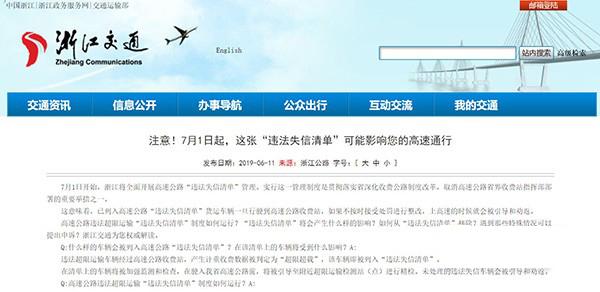 從2019年7月1日起,浙江將全面開展高速公路“違法失信清單”管理。屆時,已列入高速公路“違法失信清單”的超限超載貨運車輛一旦行駛到高速公路收費站,如果不按時接受處罰進行整改,就會被引導和勸返。