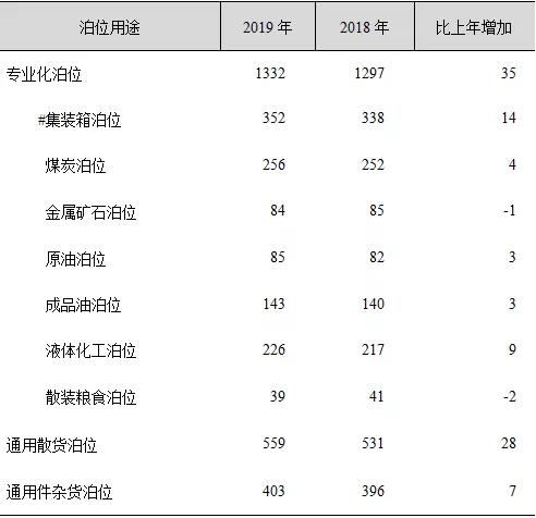 全國萬噸級及以上泊位中,專業(yè)化泊位1332個,比上年增加35個;通用散貨泊位559個,增加28個;通用件雜貨泊位403個,增加7個。