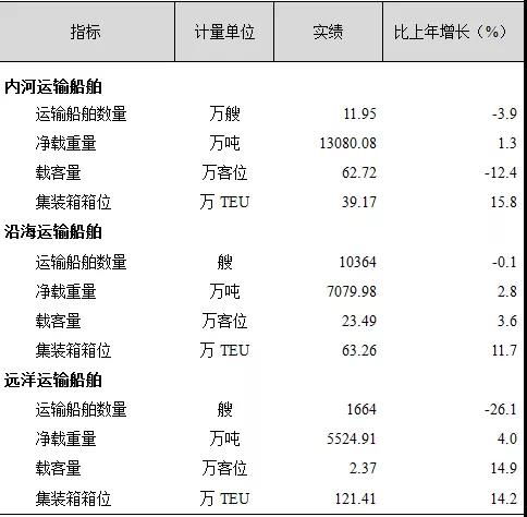 年末全國擁有水上運(yùn)輸船舶13.16萬艘,比上年下降4.0%;凈載重量25684.97萬噸,增長2.3%;載客量88.58萬客位,下降8.0%;集裝箱箱位223.85萬標(biāo)準(zhǔn)箱,增長13.8%。