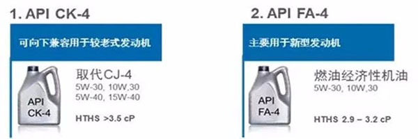 API CK-4和FA-4是API柴機油序列史上第一次分割出的兩套并行規格。API CK-4和FA-4最大的差別在于高溫高剪切值,前者大于3.5cP,而后者為2.9至3.2cP。API CK-4可向下兼容用于較老式的發動機,取代API CJ-4,它包含15W-40、10W-30、5W-30和5W-40粘度;另一邊API FA-4主要用于新型發動機,為燃油經濟型機油類別,包含10W-30和5W-30粘度。