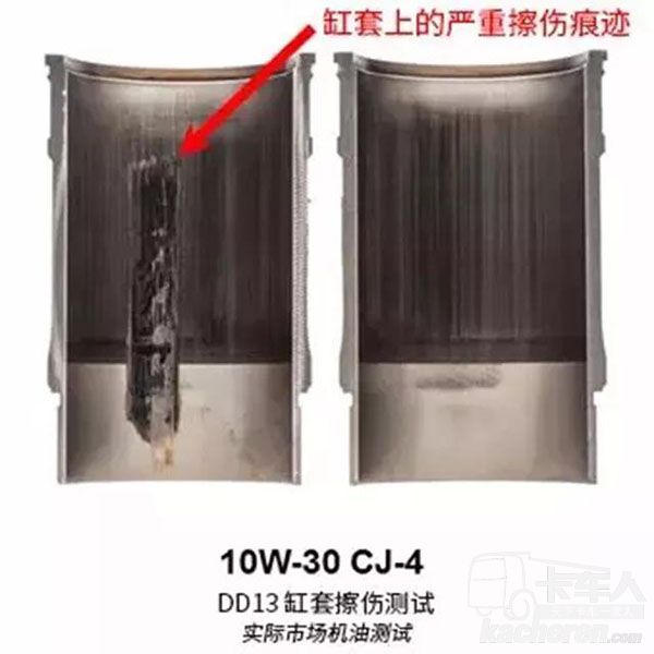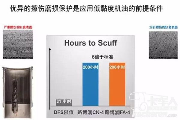 當機油的粘度降低,油膜的厚度隨之會變得更薄,與之相伴隨地會產生更復雜的流動和界面效應。此時,發動機油的配方中就需要更多加強磨損保護性能。所以優異的磨損保護是應用低粘度機油的前提條件。路博潤對此在DD13發動機上做了和API CJ-4級別的對比測試,發現應用10W-30粘度的API CJ-4油品的缸套上會在早期就出現嚴重的擦傷痕跡,而使用路博潤配方API CK-4和FA-4油品,發動機缸套上出現擦傷的時間是標準限制的6倍之多。“很多API CJ-4規格的機油都設計于10年以前,對新硬件的適用性就會顯得捉襟見肘。”