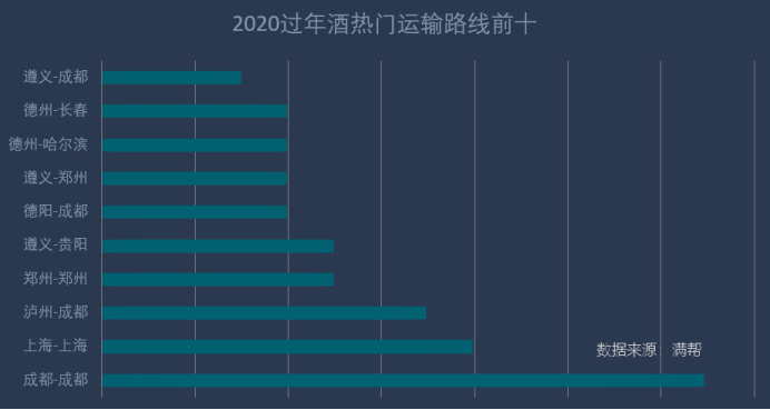 酒類運輸前十條熱門路線中,前三基本無變化,仍是成都-成都,上海-上海,瀘州-成都,但德州出發(fā)路線熱度降低,國酒茅臺之鄉(xiāng)遵義出發(fā)路線熱度升高。今年或受東北疫情影響,德州出發(fā)線路僅上榜兩條:德州-哈爾濱,德州-長春,而去年同期,過年酒前十熱門路線中,德州上榜六條:德州-哈爾濱、德州-通遼、德州-唐山、德州-成都、德州-長春、德州-赤峰。遵義-貴陽線路去年上榜前十熱門路線第七名,今年升至第五名,且今年首次遵義-鄭州,遵義-成都上榜前十熱門路線。